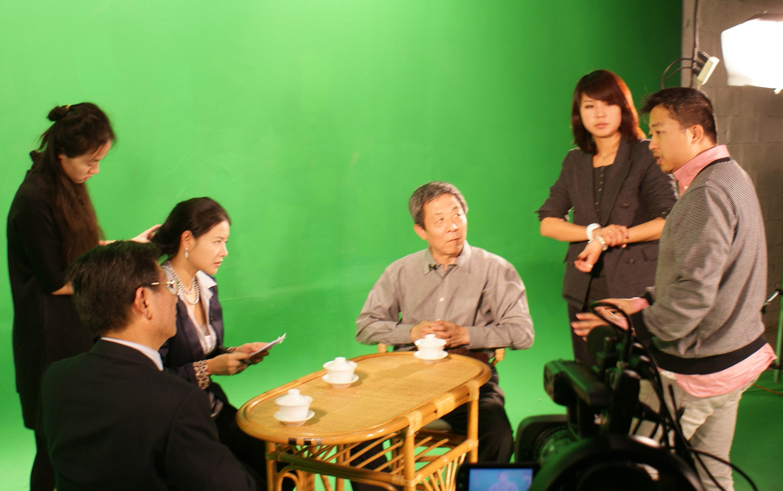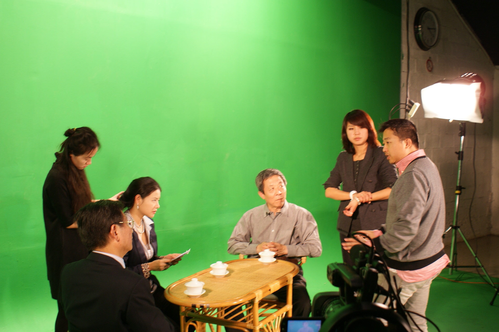 照片:《乡情侨音》录制现场,主持人胡艺瀚(左四)和凤凰卫视法国公司经理刘亚中(左三)和导演骆昊(左一)交换意见